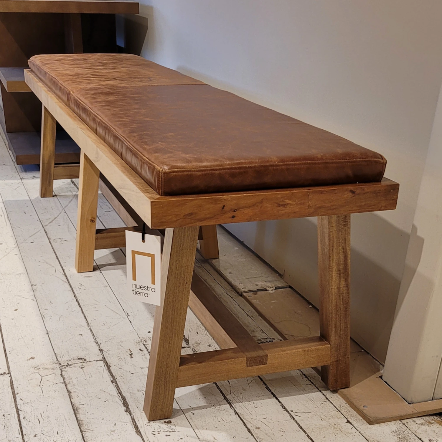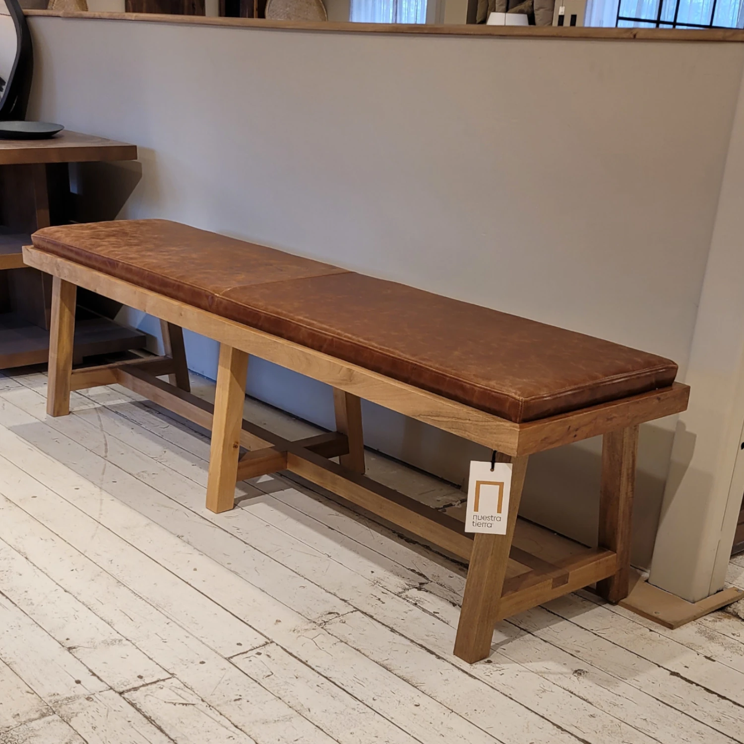 Banqueta De Madera Loro Blanco Tapizada En Cuero Walnut